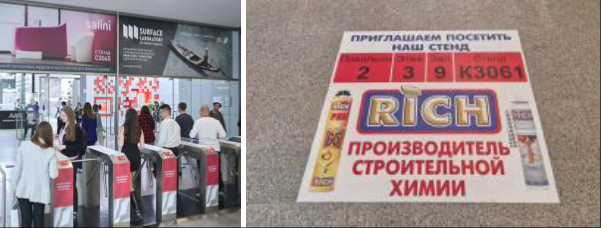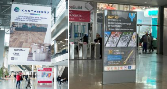 俄罗斯莫斯科国际卫浴展展厅入口区广告、玻璃表面贴纸和导航地贴等,占据观众必经动线。