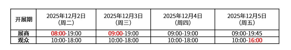 ※参展商不晚于2025年12月1日14:00抵达展馆布展,15:30所有展品拆箱完成,包装移除,16:00展馆清洁,杂物移除。