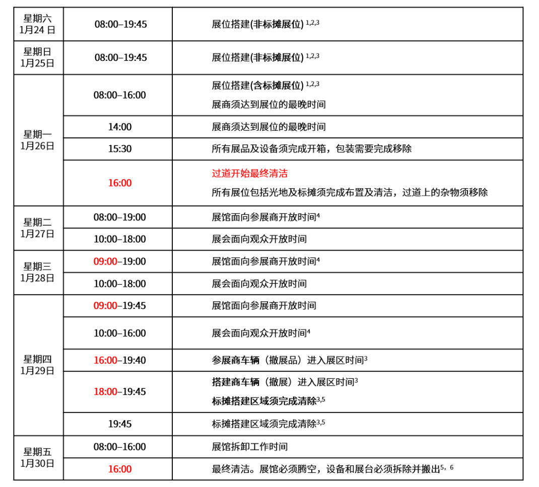 额外的展品只能在展览期间的09:00至10:00(第一个展览日-1月27日的08:00起)和18:00至19:00带入。在最后一个展览日-1月29日,车辆将在18:00后被允许进入装卸区。