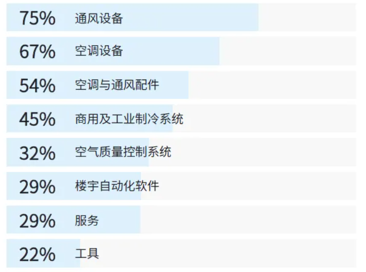 通风设备、空调设备、空调与通风配件、商业和工业制冷系统、楼宇自动化软件、空气质量控制系统、工具、服务